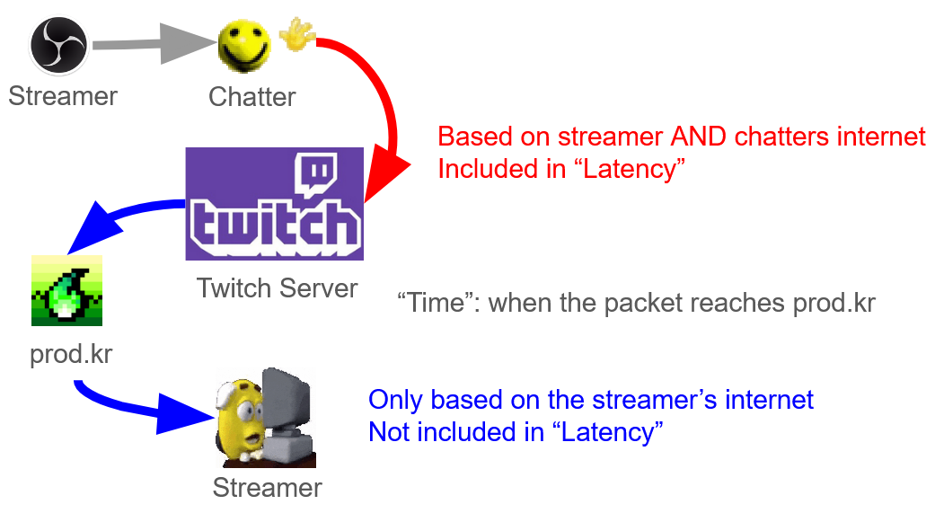 Two fields, time and latency are important in the packet. latency refers to the time it took for the click packet to arrive from chatter's PC to Twitch's servers, where time refers to the point in time where the packet reached prod.kr. The goal is to get the timestamp for when the chatter clicked the screen, so it would feel accurate to the chatter.